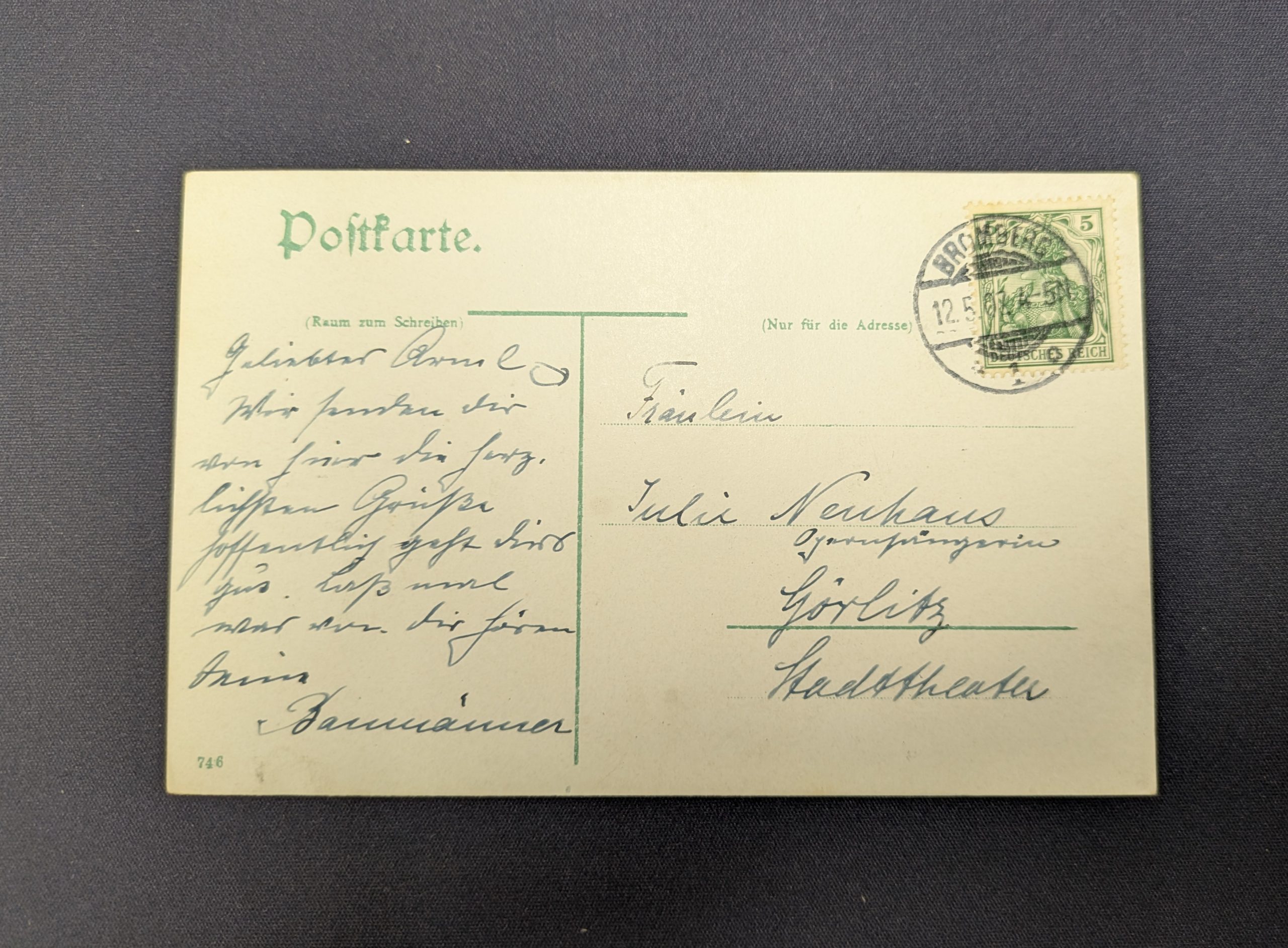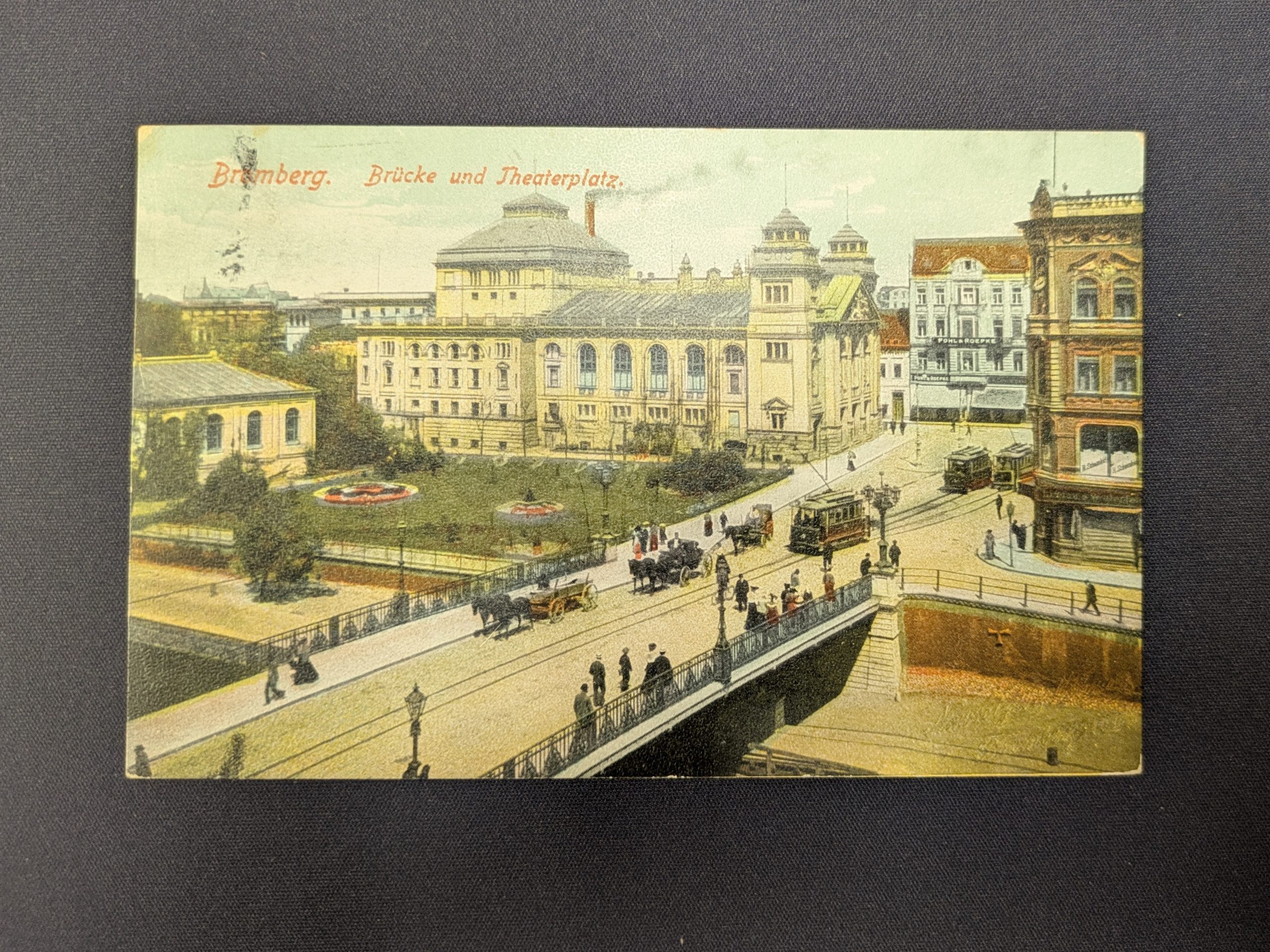 Der Theaterplatz in Bromberg war schon damals ein kulturelles Zentrum und ein beliebtes Motiv auf historischen Postkarten. Zusammen mit der dargestellten Brücke ergibt sich ein lebendiges Panorama, das nicht nur Sammler, sondern auch Liebhaber alter Stadtansichten begeistert.