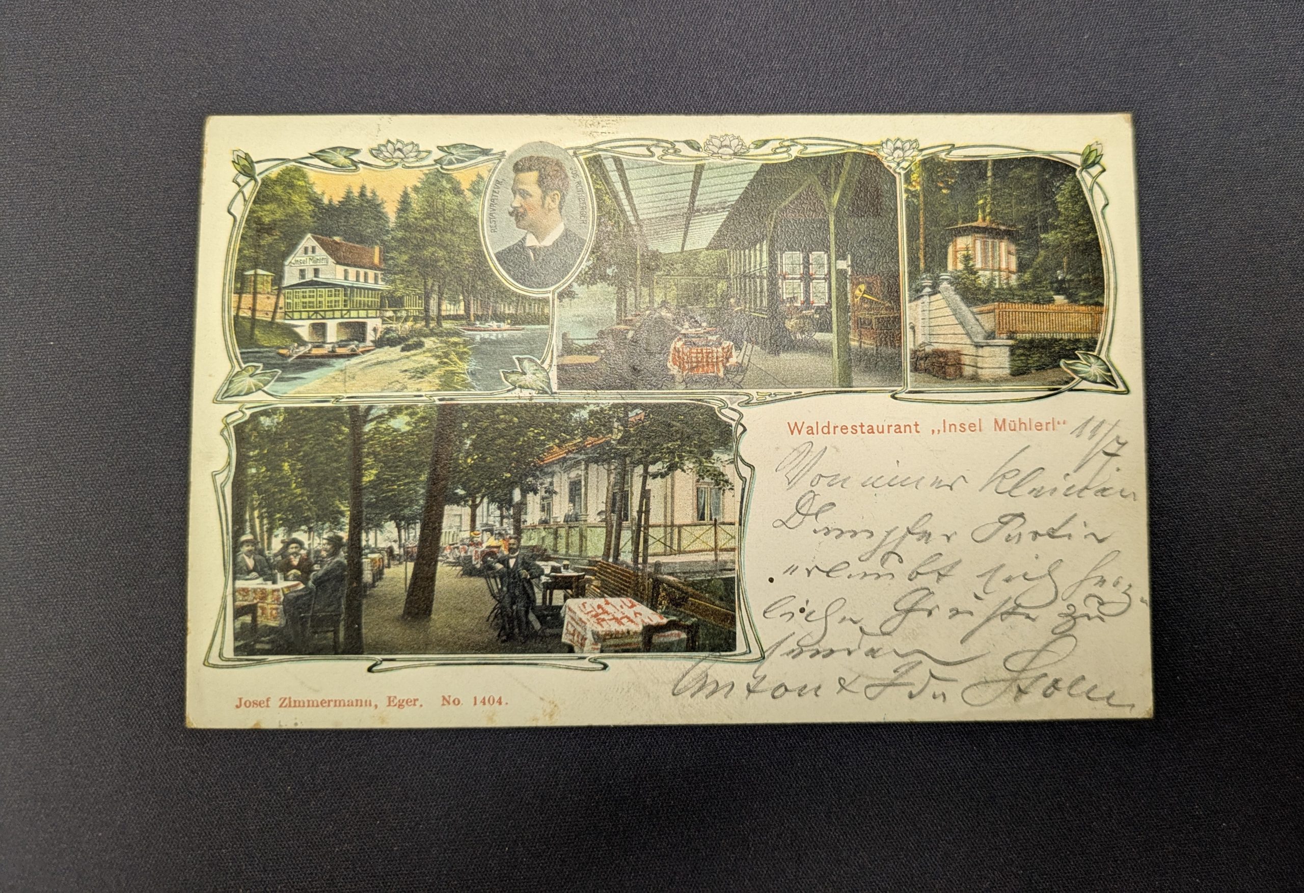 Diese farbig kolorierte Ansichtskarte zeigt das beliebte Waldrestaurant „Insel Mühlerl“ bei Eger/Franzensbad im böhmischen Bäderdreieck. Die Karte ist ein reizvolles Zeitdokument und vermittelt eindrucksvoll die besondere Atmosphäre der Jahrhundertwende, als Eger und Franzensbad als mondäne Kurorte zahlreiche Besucher aus ganz Europa anzogen.