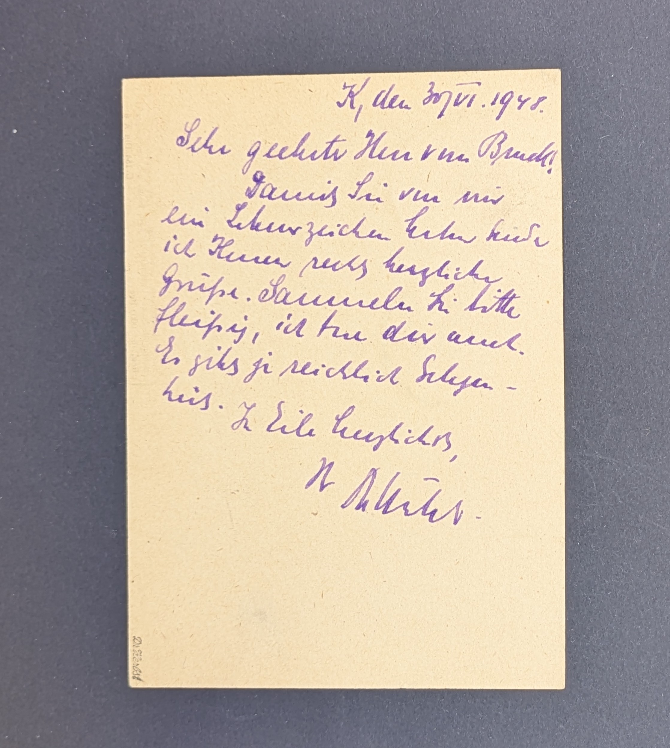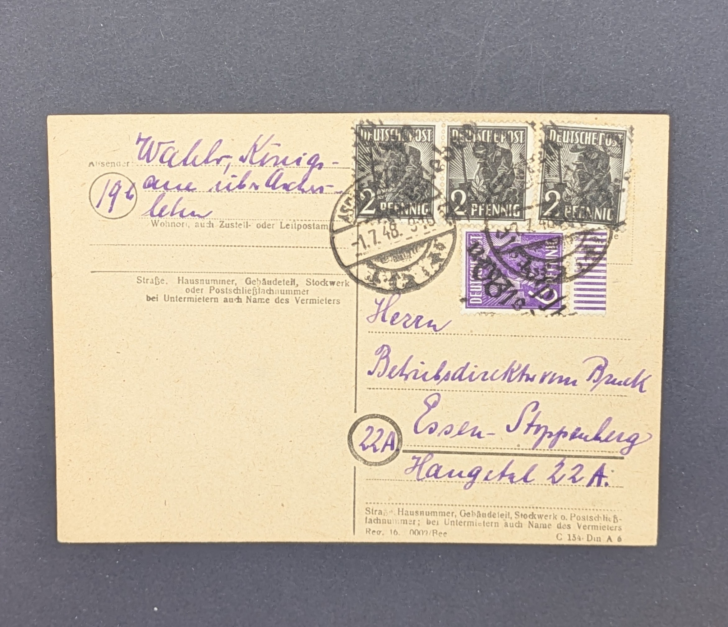 Zum Verkauf steht eine historische Bedarfskarte vom 1. Juli 1948, sorgfältig frankiert mit drei Exemplaren der Mi.-Nr. 166 IV sowie einem Exemplar der Mi.-Nr. 167 IV. Die Karte trägt die Signatur von Dr. Herbst und stellt ein bemerkenswertes Dokument der Deutschen Nachkriegsphilatelie dar.