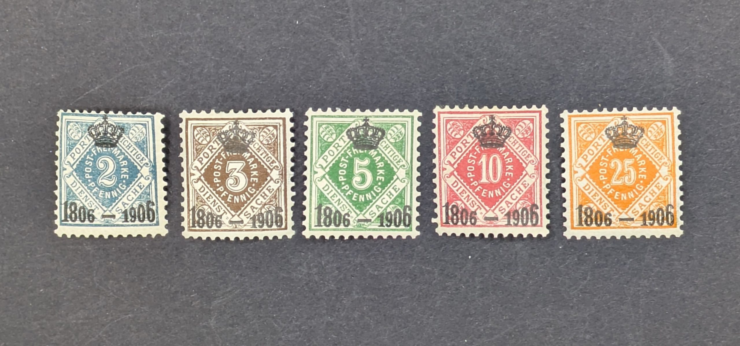 Entdecken Sie diesen ungebrauchten Satz der Württemberg Dienstmarken von 1906, bestehend aus den Mi.-Nr. 107 bis 111. Diese klassische Serie zeigt die offiziellen Dienstmarken des Königreichs Württemberg und ist ein absolutes Highlight für Sammler historischer Briefmarken und Experten für württembergische Philatelie.
