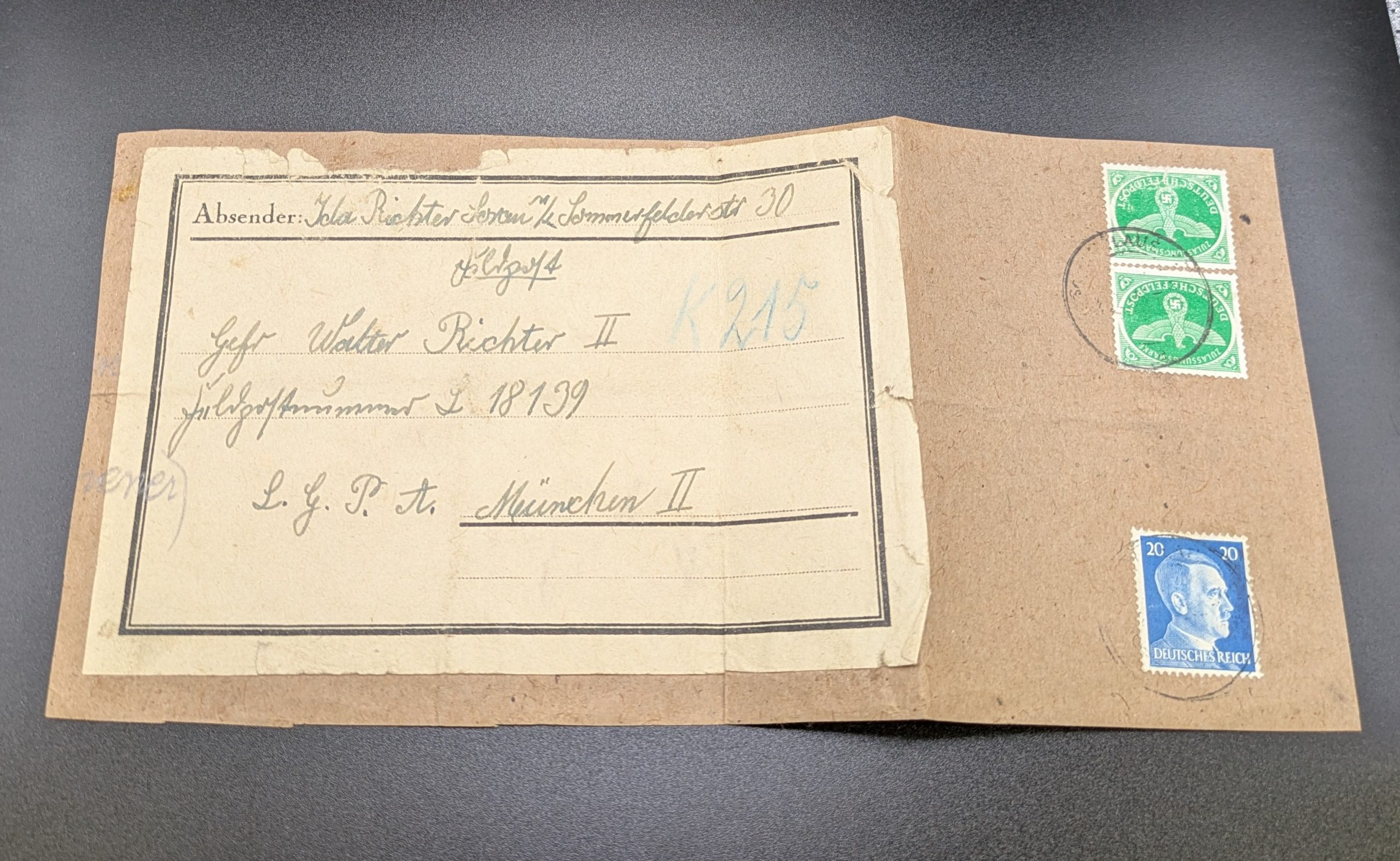 Dieses historische Stück stammt aus der Zeit des Zweiten Weltkriegs und zeigt eindrucksvoll den postalischen Ablauf der deutschen Feldpost. Die Päckchenadresse ist vollständig erhalten und trägt alle relevanten postalischen Merkmale, wie Stempelabschläge und handschriftliche Eintragungen, die den zeittypischen Charakter unterstreichen.