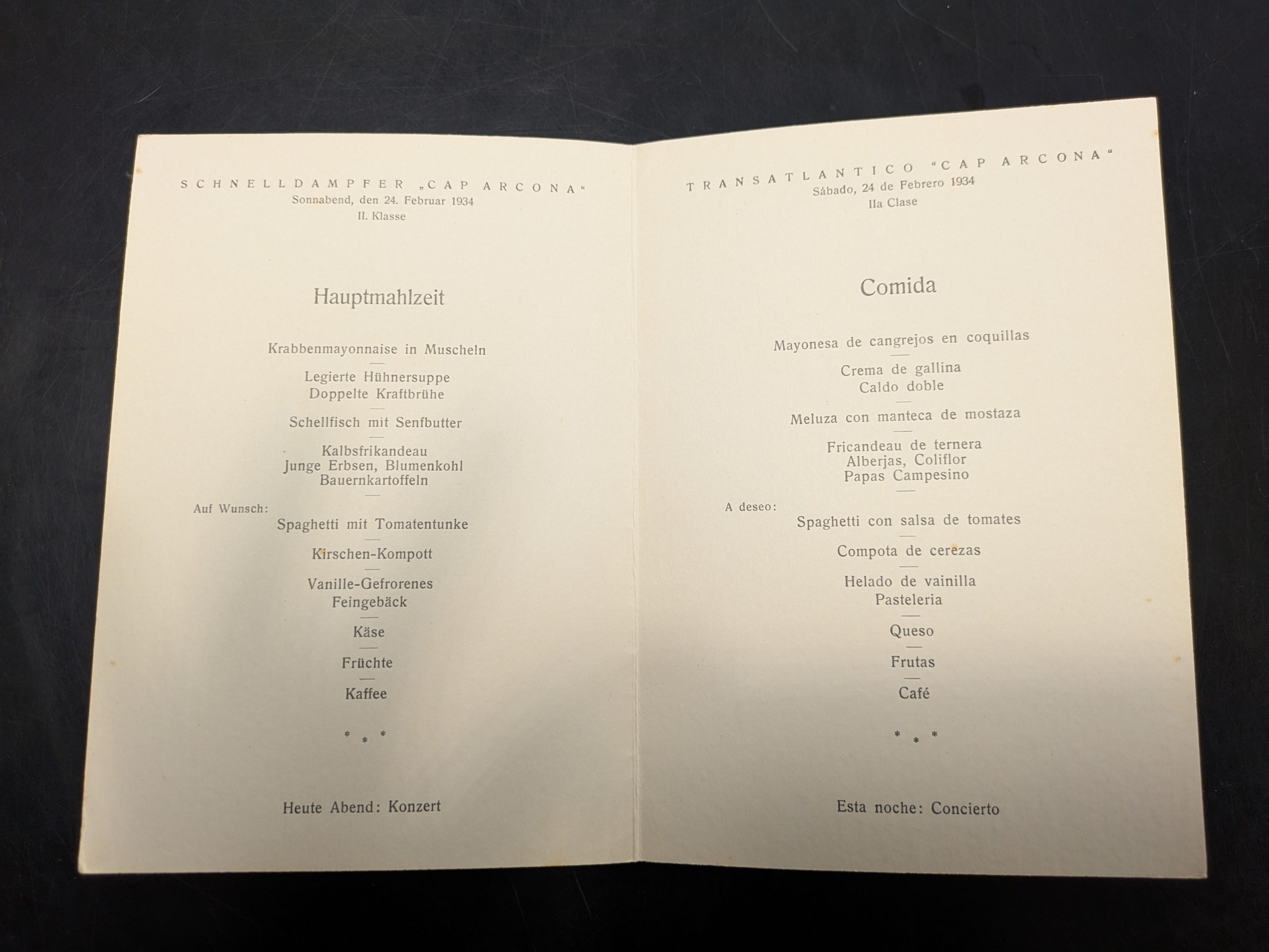 Diese original farbige Menükarte des legendären Passagierdampfers Cap Arcona aus dem Jahr 1934 ist ein einzigartiges Stück maritimer Zeitgeschichte. Der luxuriöse Ozeandampfer, bekannt als „Schönste Yacht des Atlantiks“, stand für Eleganz, Komfort und das goldene Zeitalter der Seefahrt.