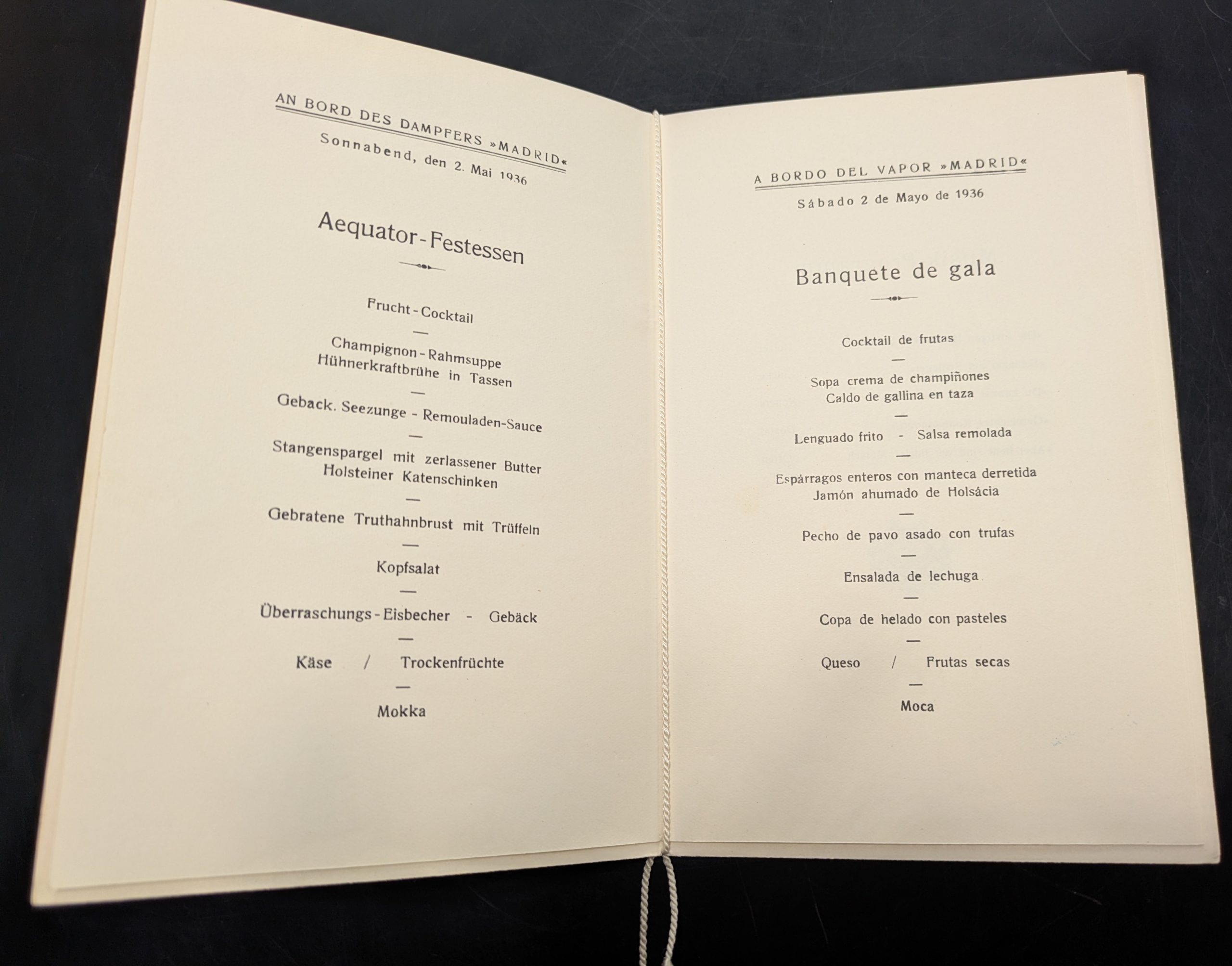 Die Menükarte wurde während einer Überfahrt des Passagierdampfers Madrid verwendet und vermittelt ein authentisches Bild des Bordlebens jener Zeit. Solche Dokumente sind heute selten erhalten und werden von Sammlern maritimer Memorabilien, Historikern und Liebhabern klassischer Schifffahrt gleichermaßen geschätzt.