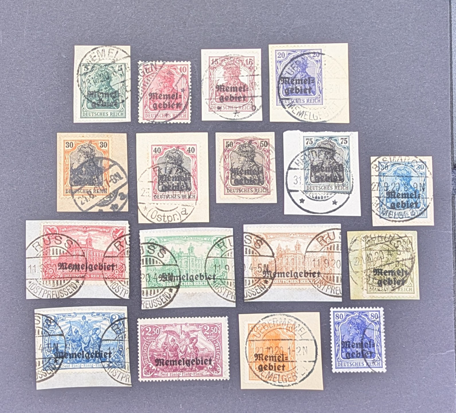 Gestempelter Satz Mi.-Nr. 1–17 des Memelgebiets (1920/22), meist auf Briefstücken. Die klassischen Ausgaben mit Aufdruck „Memelgebiet“ auf deutschen Marken sind begehrte Sammelobjekte der Memel-Philatelie und zeigen historische Bezüge zur Zeit nach dem Ersten Weltkrieg. Saubere Abstempelungen, teils auf Briefstücken, ideal für Sammler und Philatelisten mit Fokus auf deutsche Gebiete und Besetzungsausgaben.