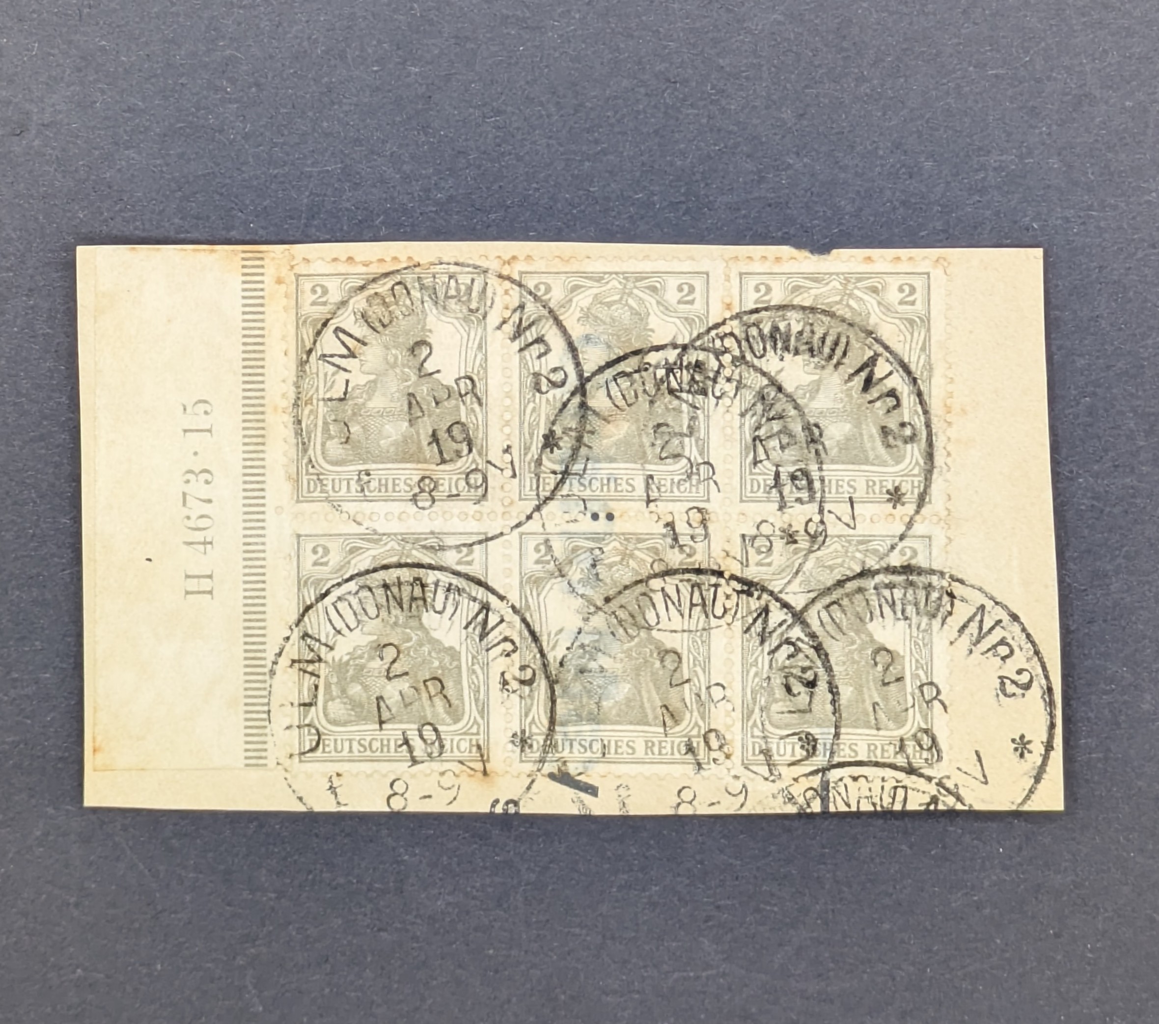 Die Mi.-Nr. 102 zeigt das bekannte Motiv der Germania und wurde in der frühen Inflationszeit ausgegeben. Der hier angebotene 6er-Block ist klar gestempelt, sauber geschnitten und auf einem Briefstück mit zeitgerechtem Poststempel erhalten. Der linke Bogenrand mit HAN macht dieses Stück zu einem besonderen philatelistischen Beleg der deutschen Inflationszeit.