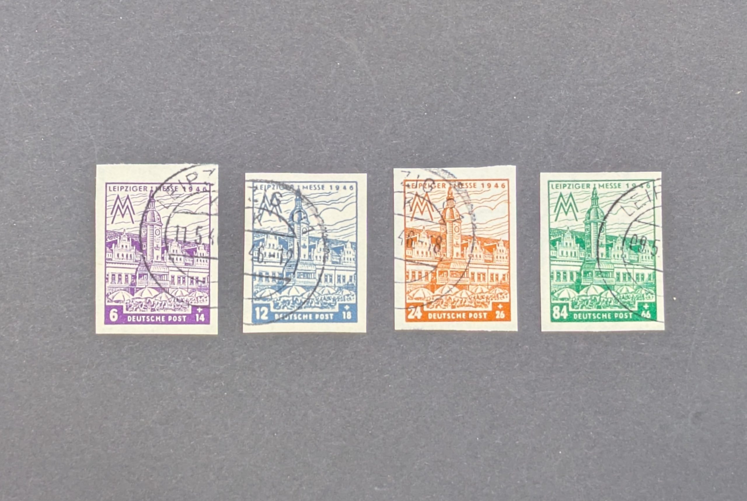 Alle vier Marken sind gestempelt und befinden sich in einem gut erhaltenen Zustand, was sie zu einem attraktiven Stück für Philatelisten macht, die ihre Sammlung um seltene Nachkriegsausgaben erweitern möchten. Die Westsachsen-Marken sind bekannt für ihre sorgfältige Gestaltung und die regionalhistorische Relevanz, wodurch sie sowohl für Sammler von deutschen Marken als auch für Liebhaber historischer Belege besonders interessant sind.