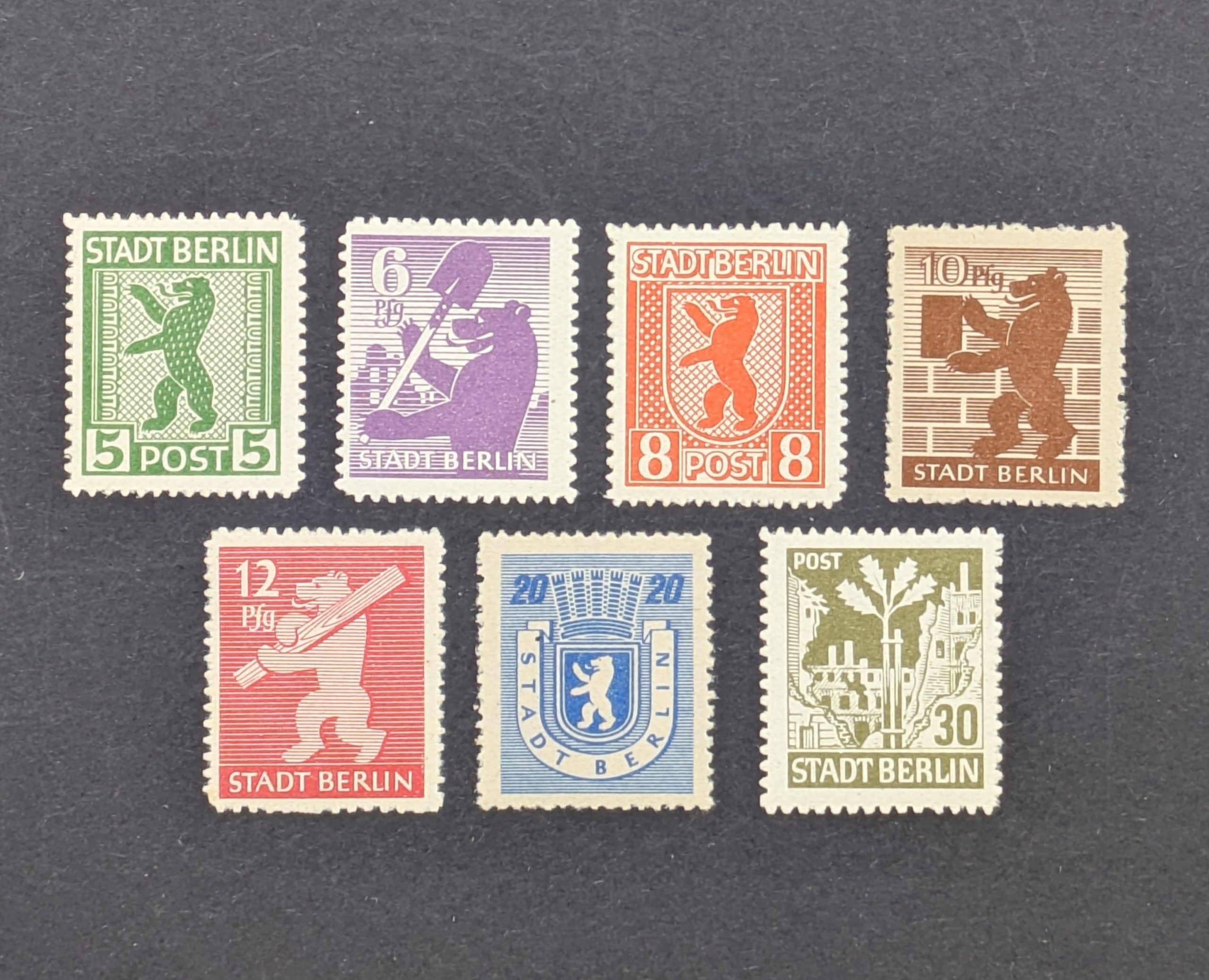 Zum Verkauf steht ein postfrischer Satz Berlin/Brandenburg aus dem Jahr 1945, bestehend aus den Michel-Nummern 1B bis 7B. Diese bedeutende Briefmarkenserie entstand unmittelbar nach dem Zweiten Weltkrieg und spiegelt die ersten philatelistischen Ausgaben der Region wider. Alle Marken sind postfrisch, d.h. in einwandfreiem Erhaltungszustand, wodurch sie besonders attraktiv für Sammler historischer deutscher Briefmarken sind.