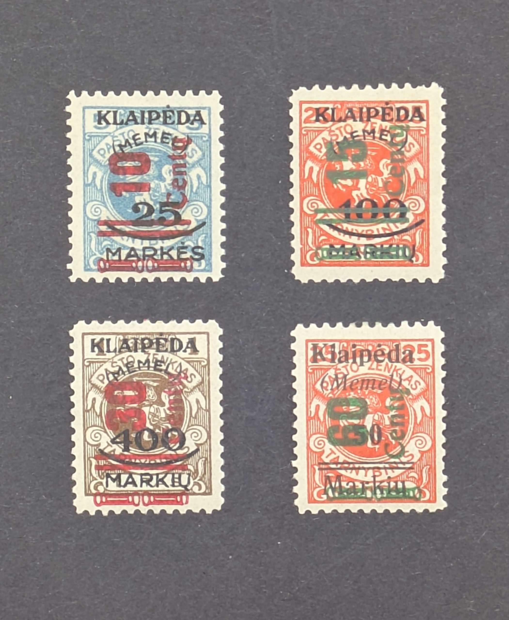 Dieser hochwertige Satz Freimarken des Memelgebietes von 1923 umfasst die Michel-Nummern 230 bis 233. Es handelt sich um eine Ausgabe mit Überdruck  auf litauischen Marken, die nach der Abtretung des Memelgebietes an Litauen herausgegeben wurden.