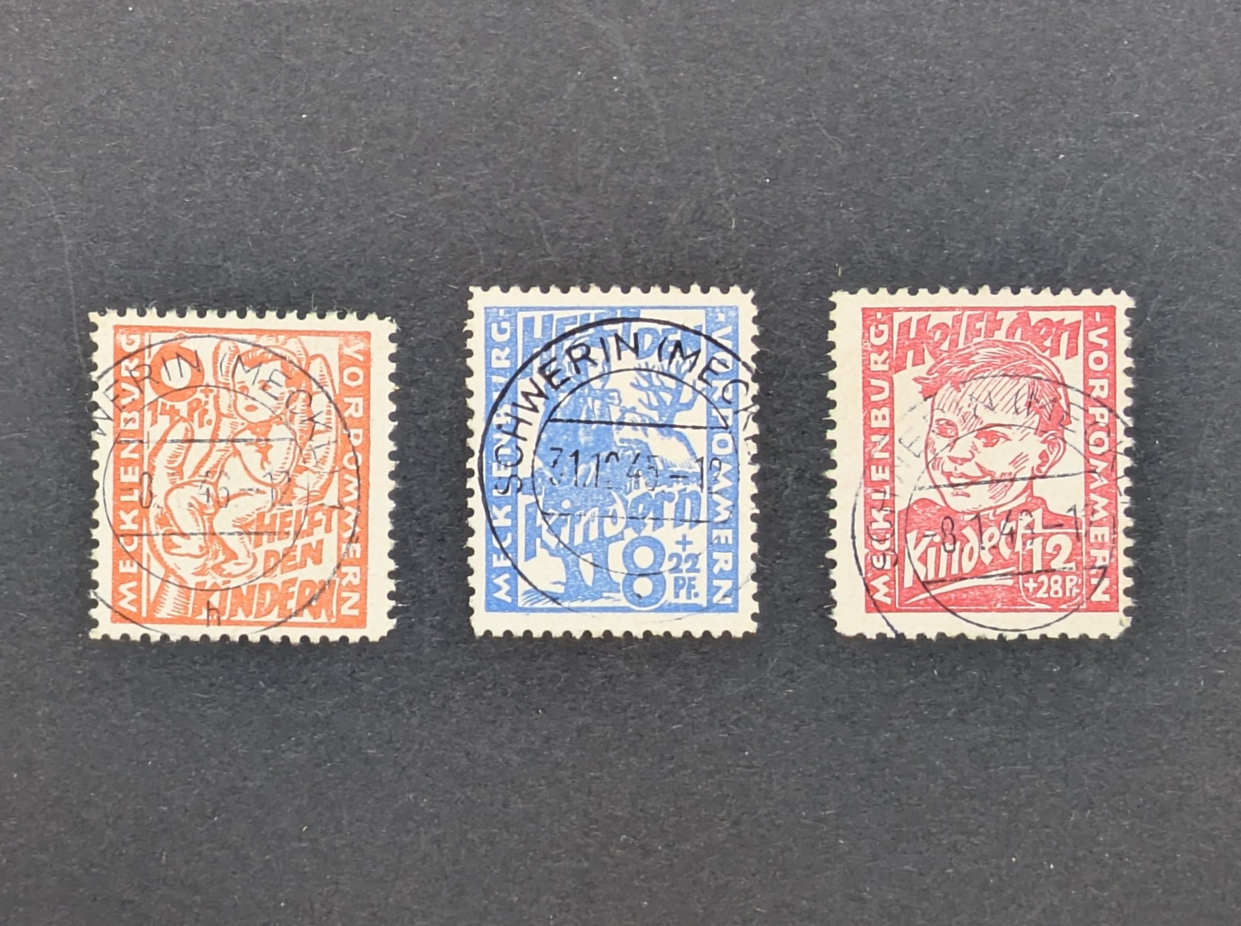 Die Marken zeigen die Motive der Kinderhilfe in Mecklenburg-Vorpommern und sind in gestempeltem Zustand, was ihre Authentizität unterstreicht. Der Satz ist gut erhalten, mit klaren Stempeln, die das Datum und die historische Verwendung widerspiegeln. Ideal für Sammler, die ihre Sammlung mit hochwertigen Marken aus der deutschen Nachkriegszeit ergänzen möchten.