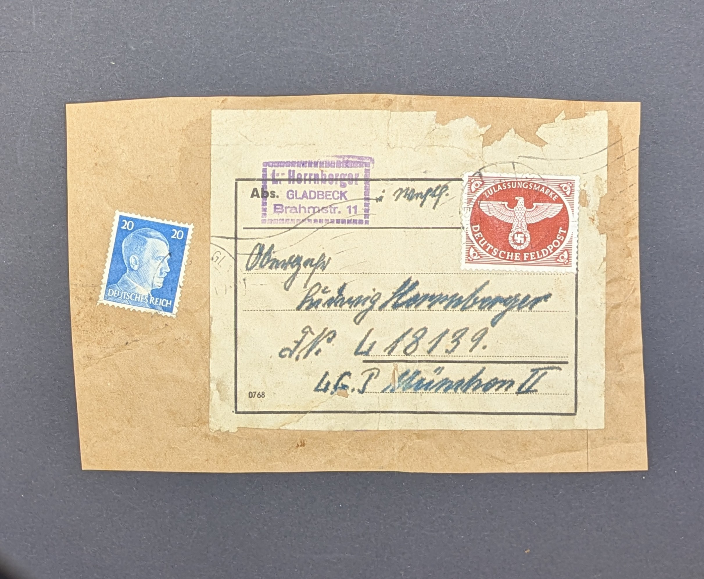 Zum Verkauf steht eine komplette Päckchenadresse aus der Zeit des Zweiten Weltkriegs, frankiert mit der Feldpostmarke Mi.-Nr. 2A , sowie Zusatzfrankatur. Dieser authentische postalische Beleg stellt ein eindrucksvolles Zeitdokument militärischer Postgeschichte dar und ist ein begehrtes Sammelobjekt für Philatelisten und Feldpost-Sammler.