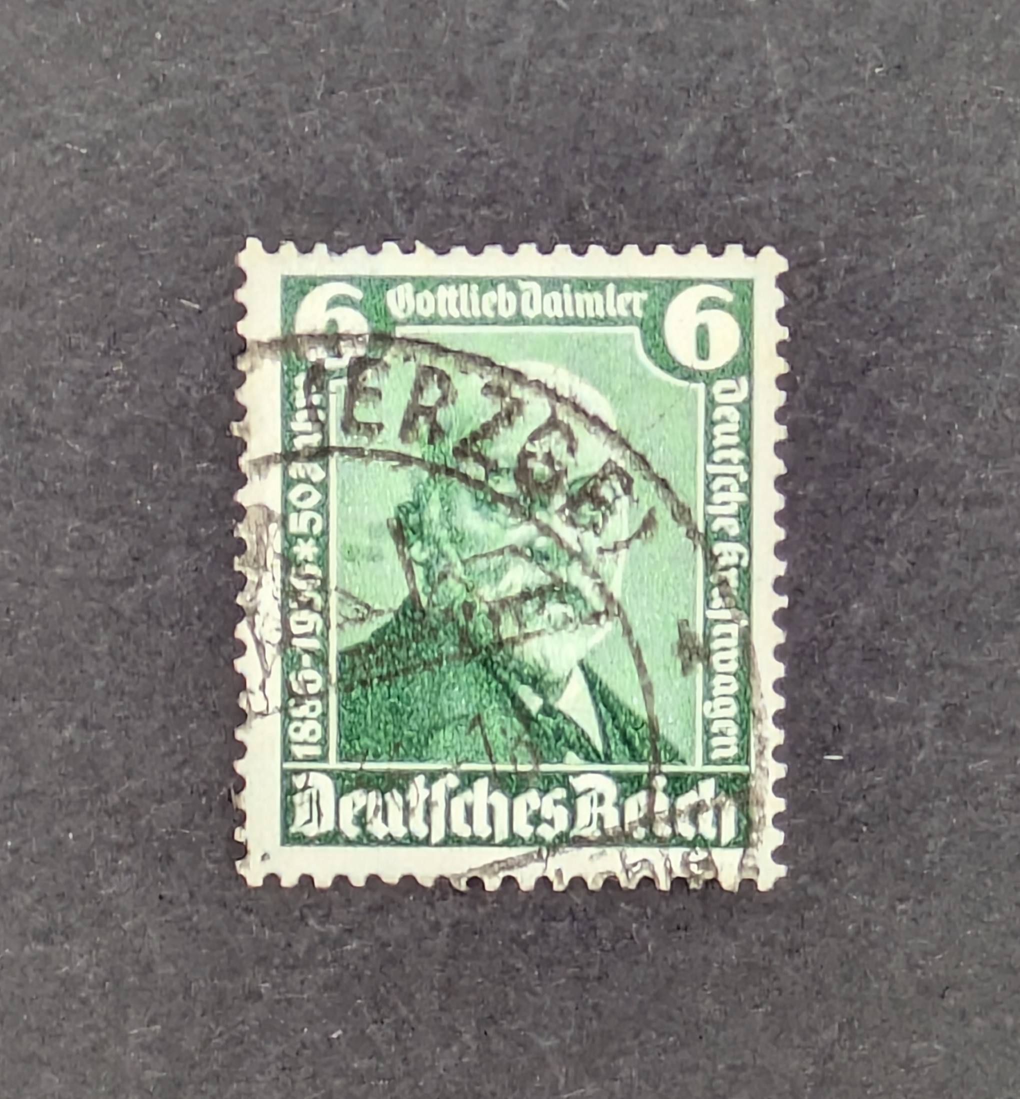 Zum Verkauf steht ein gestempeltes Exemplar der Mi.-Nr. 604 III, der berühmten Briefmarke „Daimler mit Kurbel am Ohr“ aus der klassischen deutschen Philatelie. Dieses Stück ist rückseitig links oben dünn, was die Erhaltung etwas beeinträchtigt, jedoch bleibt es ein wertvolles Belegstück für Sammler historischer deutscher Briefmarken.