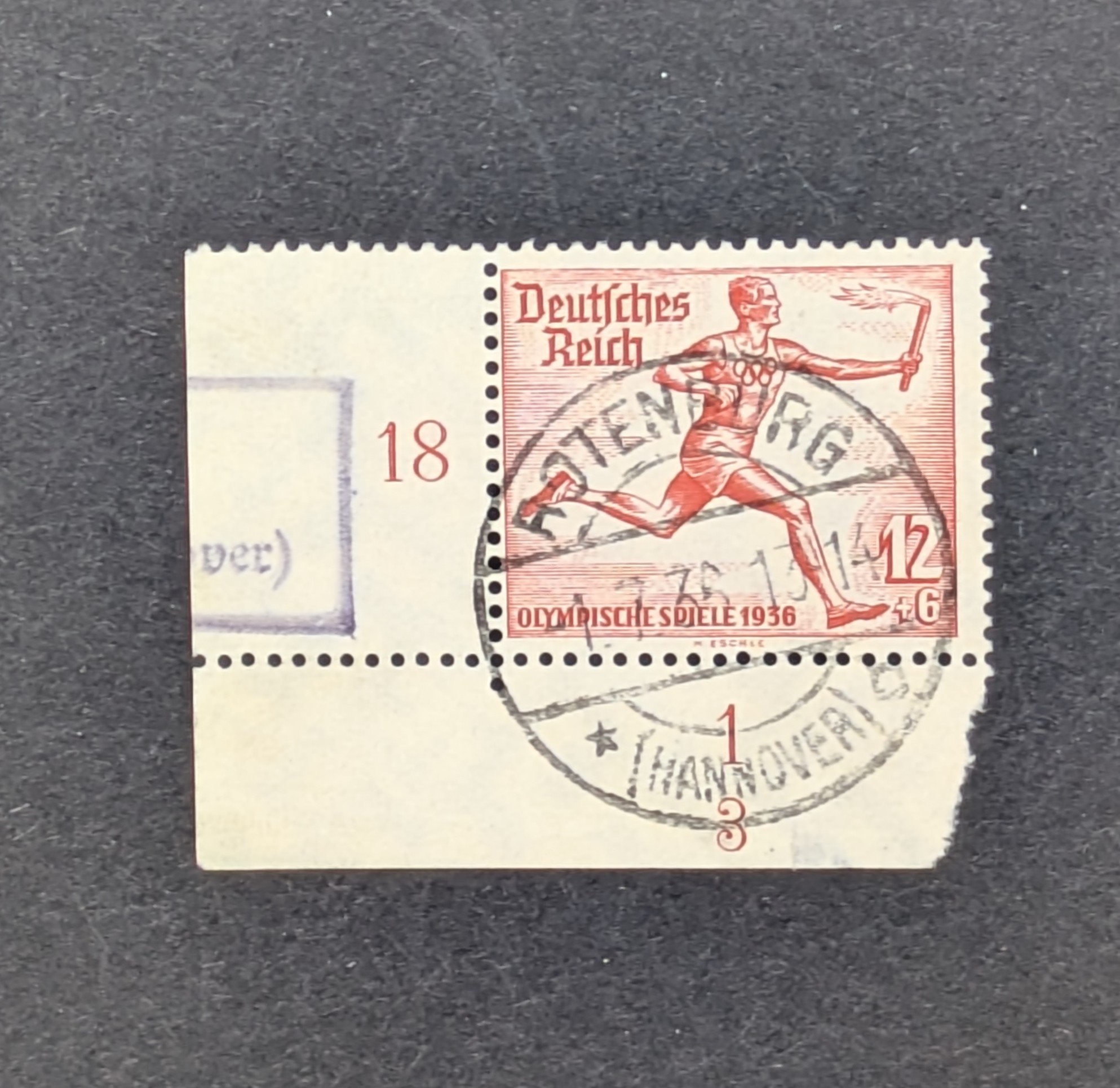Zum Verkauf steht eine gestempelte Mi.-Nr. 613 als linkes unteres Eckrandstück. Dieses Stück besticht durch seinen klaren, sauberen Stempel und die perfekte Eckrandlage, was es besonders attraktiv für Sammler von Bogenecken macht.