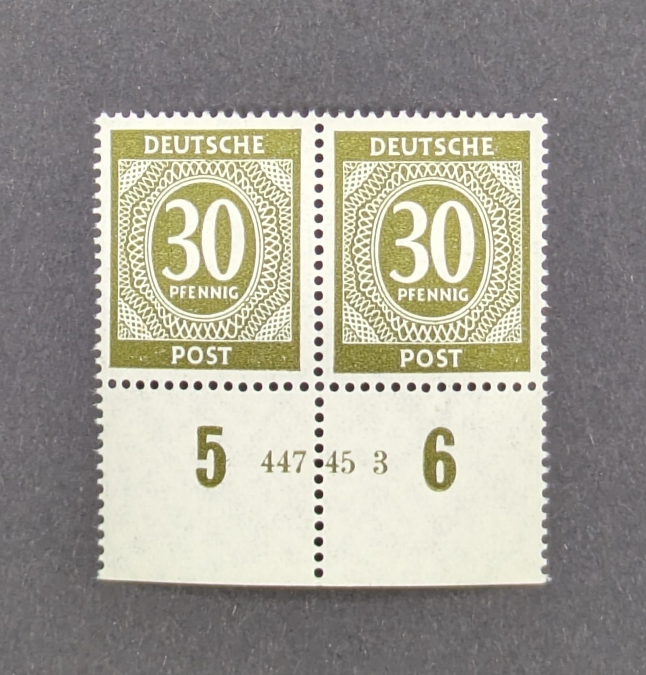 Zum Verkauf steht ein postfrisches Unterrandpaar der Mi.-Nr. 928 ( Alliierte Besetzung), das zusätzlich die selten gefundene Hausauftragsnummer (HAN) am Bogenrand trägt.