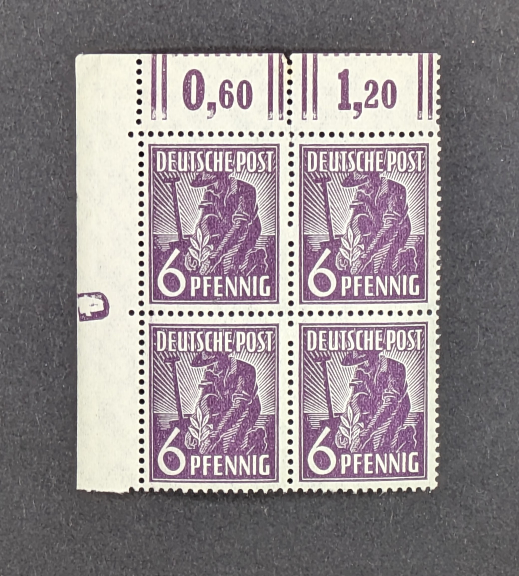Dieser postfrische Eckrandviererblock zeigt die Mi.-Nr. 944 und befindet sich oben links auf dem Bogen. Besonders attraktiv für Philatelisten ist das sichtbare Druckereizeichen, das die Authentizität und Seltenheit dieses Blocks unterstreicht.