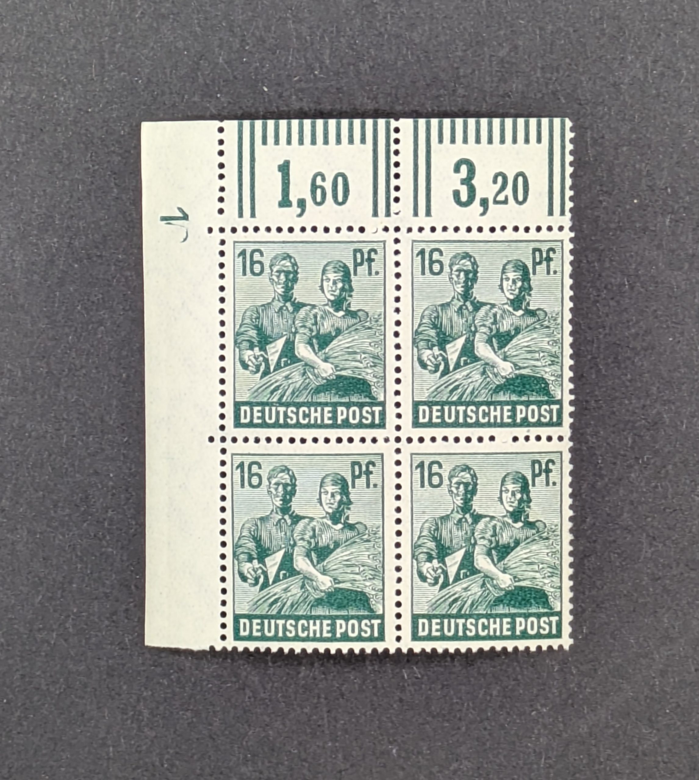 Zum Verkauf steht ein postfrischer Eckrand-Viererblock der Mi.-Nr. 949, oben links, inklusive Druckereizeichen. Der Viererblock befindet sich in makellosem Zustand, ohne Falten, Risse oder Falzspuren – ein Highlight für jede anspruchsvolle Briefmarkensammlung.