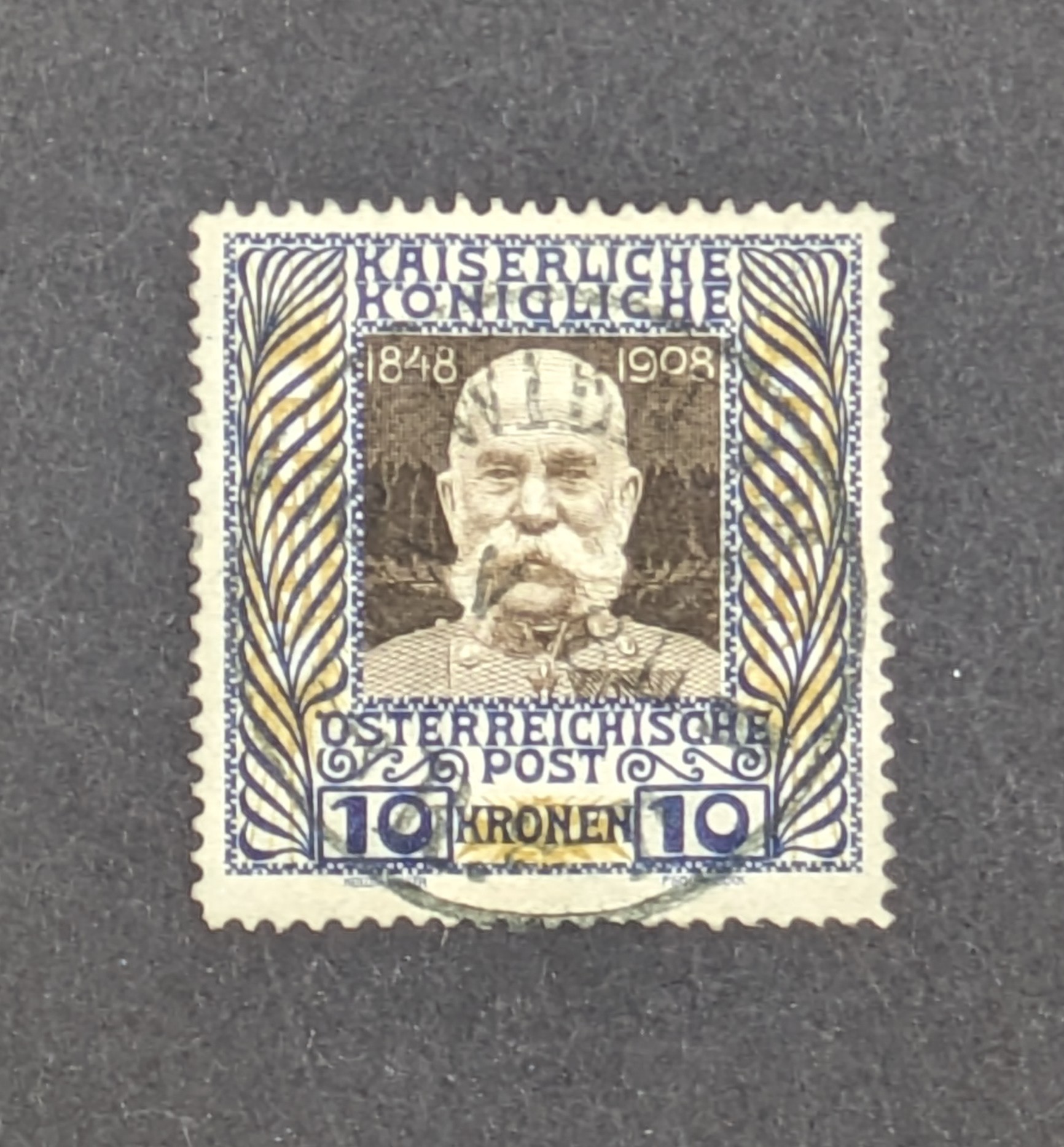 Die Briefmarke Österreich Mi.-Nr. 156 aus dem Jahr 1908 gehört zur beliebten Freimarkenserie „Franz Joseph I.“, die anlässlich des 60-jährigen Regierungsjubiläums des Kaisers herausgegeben wurde. Das hier angebotene Exemplar zeigt den Wert zu 10 Kronen und trägt einen klaren Stempelabschlag, der die Echtheit der postalischen Verwendung bestätigt.