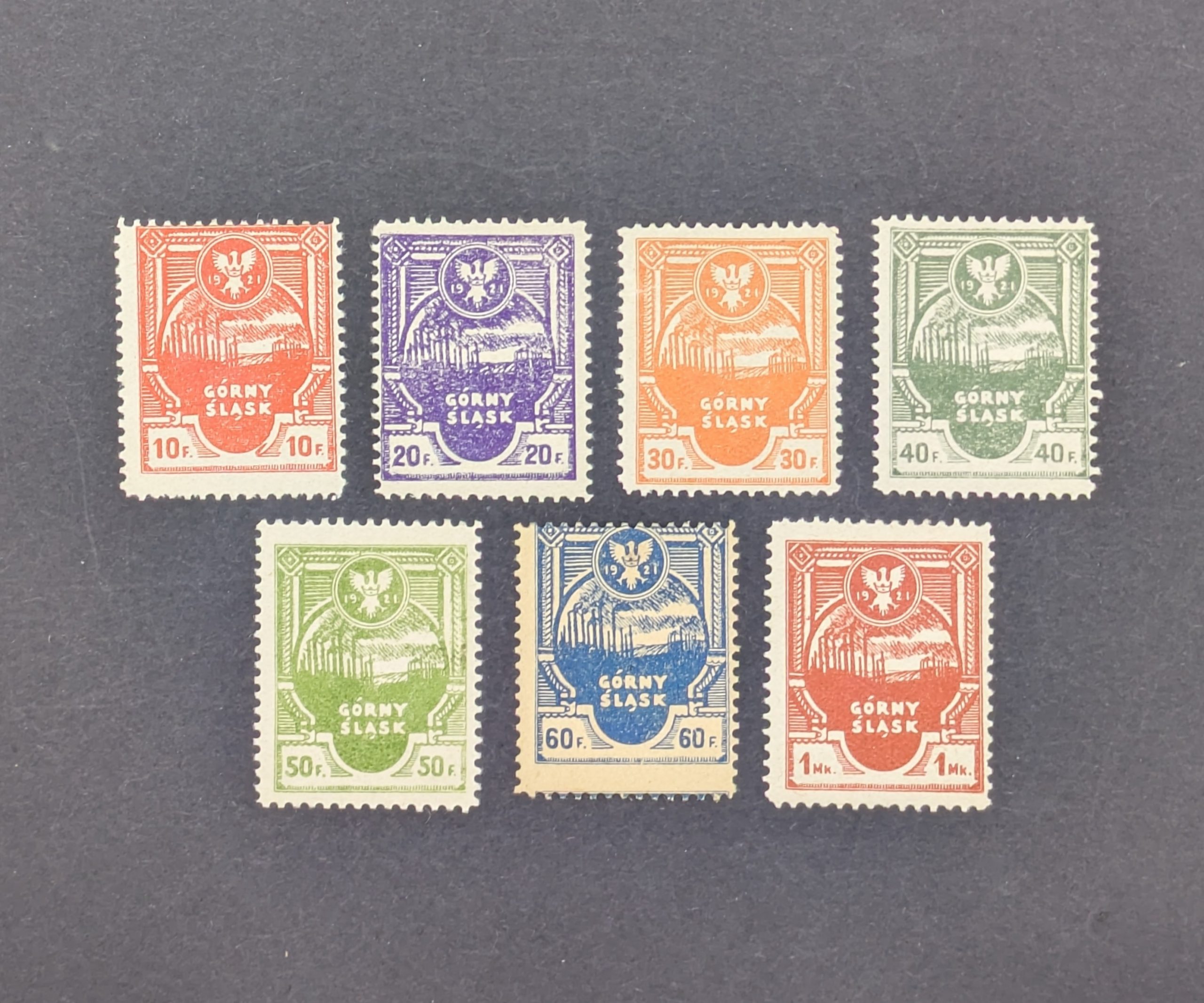 Zum Verkauf steht eine seltene Serie ungebrauchter Briefmarken aus dem östlichem Oberschlesien, Ausgabejahr 1921, Michel-Nummern 1A bis 7A. Diese klassischen Briefmarken zählen zu den begehrtesten Sammlerstücken der Oberschlesien-Philatelie und sind in makellosem, ungebrauchtem Zustand erhalten.