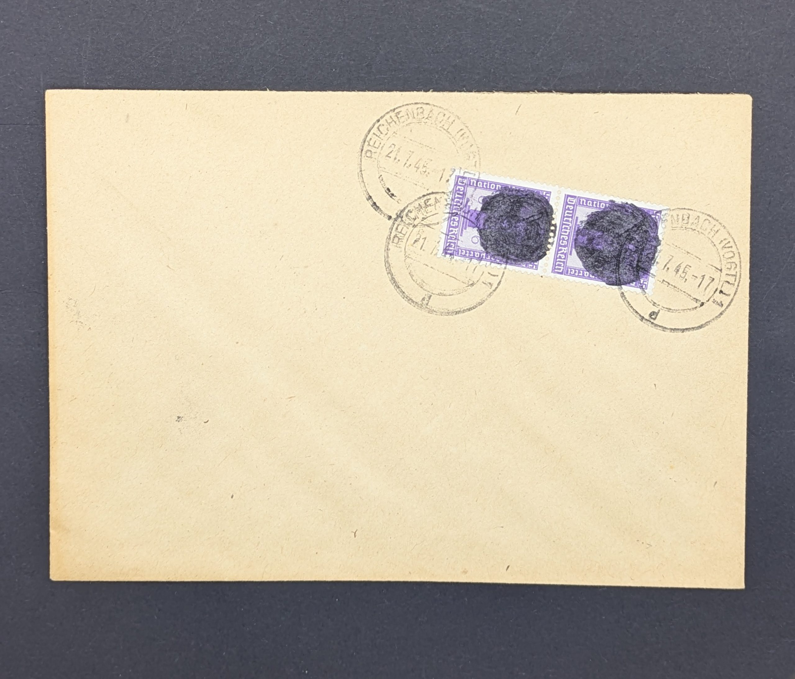 Die Entwertung der beiden Dienstmarken erfolgte mit dem klar abgeschlagenen Tagesstempel „Reichenbach (Vogtland), 1.7.45“, einem postalisch bedeutenden Datum aus der unmittelbaren Nachkriegszeit der Sowjetischen Besatzungszone (SBZ). Solche Belege dokumentieren eindrucksvoll die improvisierten postalischen Übergangslösungen, die in Sachsen – insbesondere in Reichenbach und Umgebung – während der Wochen nach Mai 1945 praktiziert wurden.
