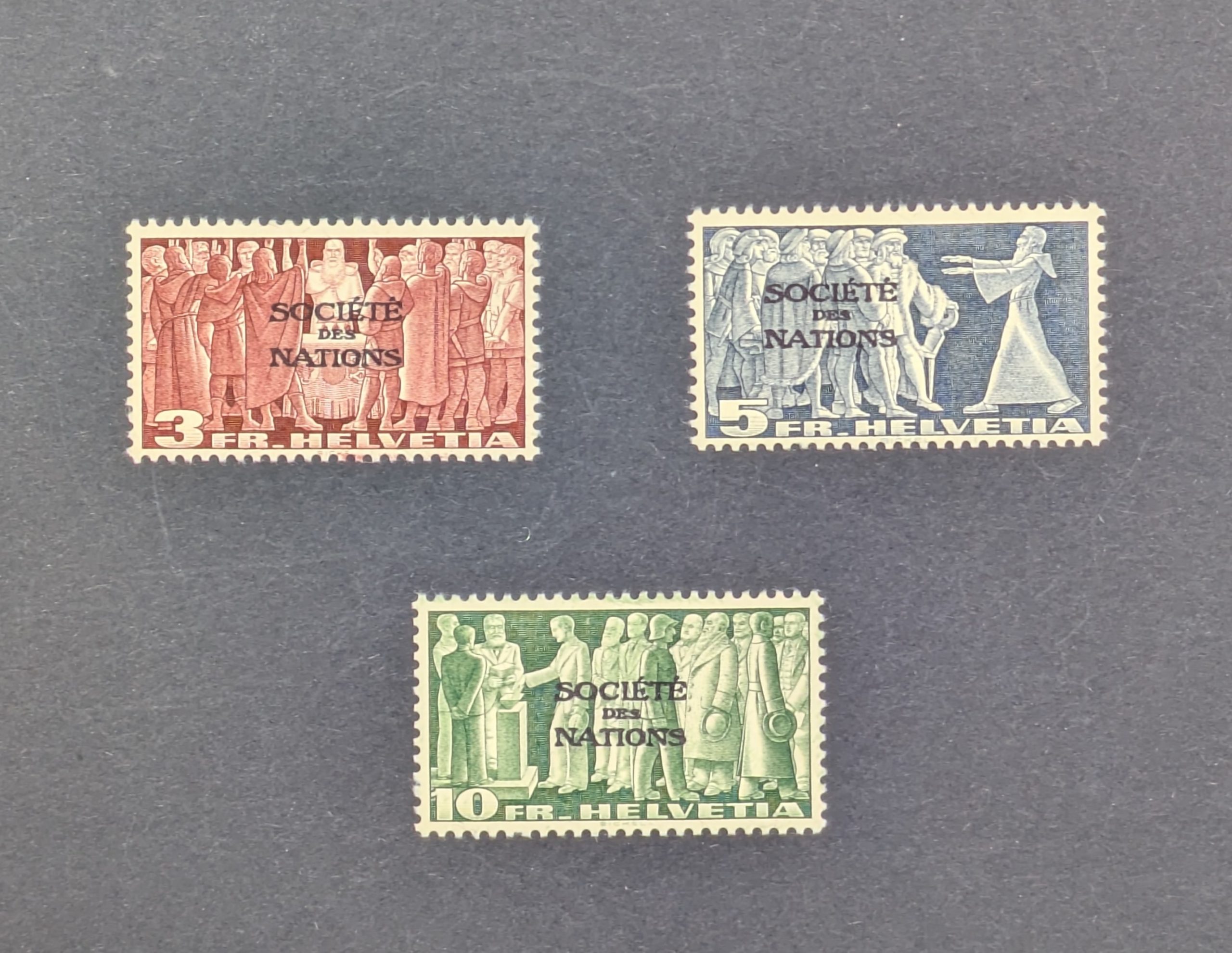 Postfrischer Satz der Schweiz von 1939 – Mi.-Nr. 65–67. Motive der Internationalen Organisation SDN (Völkerbund). Seltene Briefmarken für Sammler, in einwandfreiem Zustand. Ideal für Philatelie-Sammlungen und Investitionen in historische Schweizer Briefmarken.